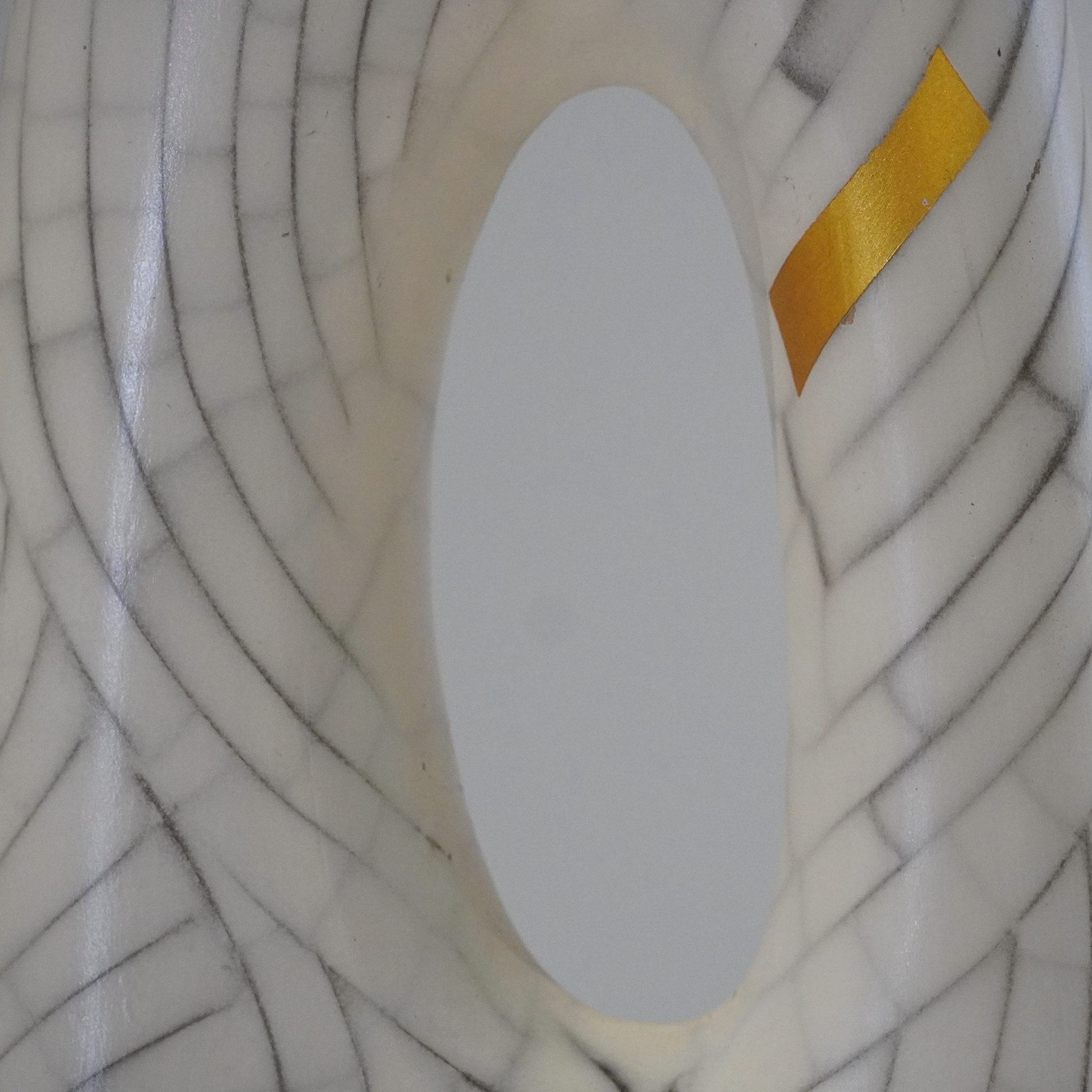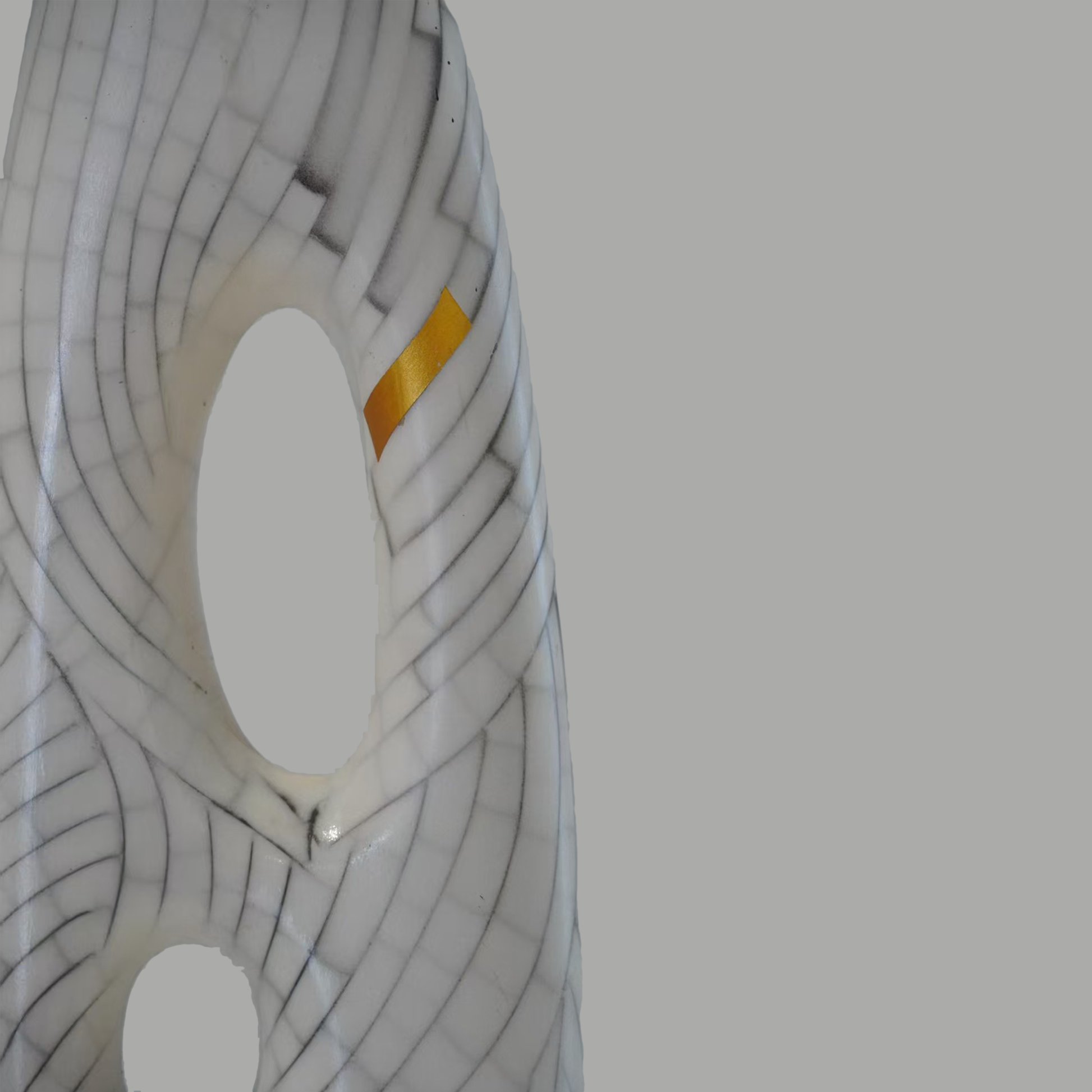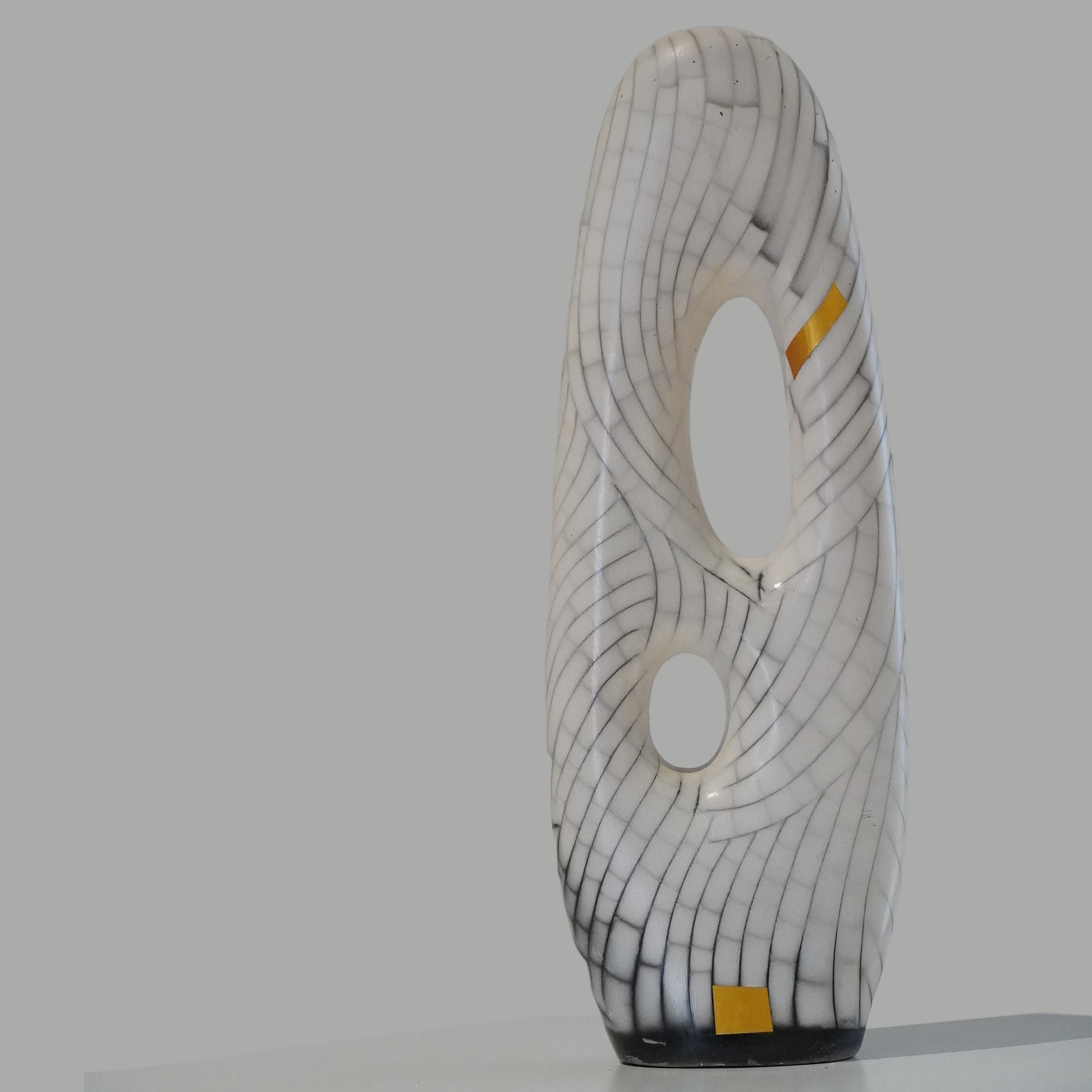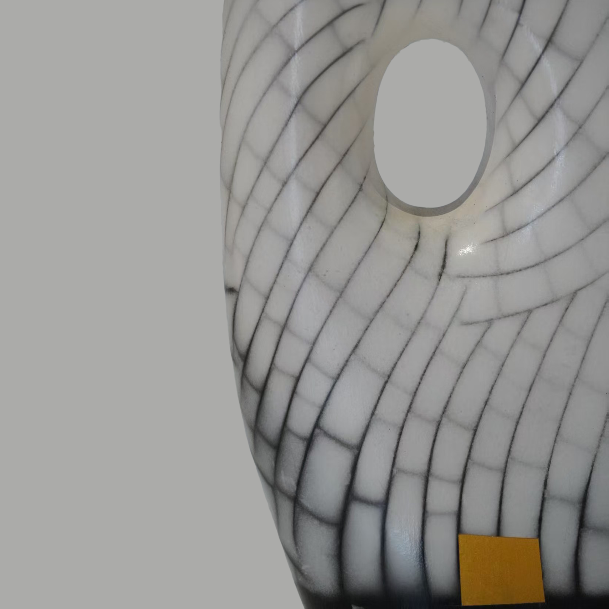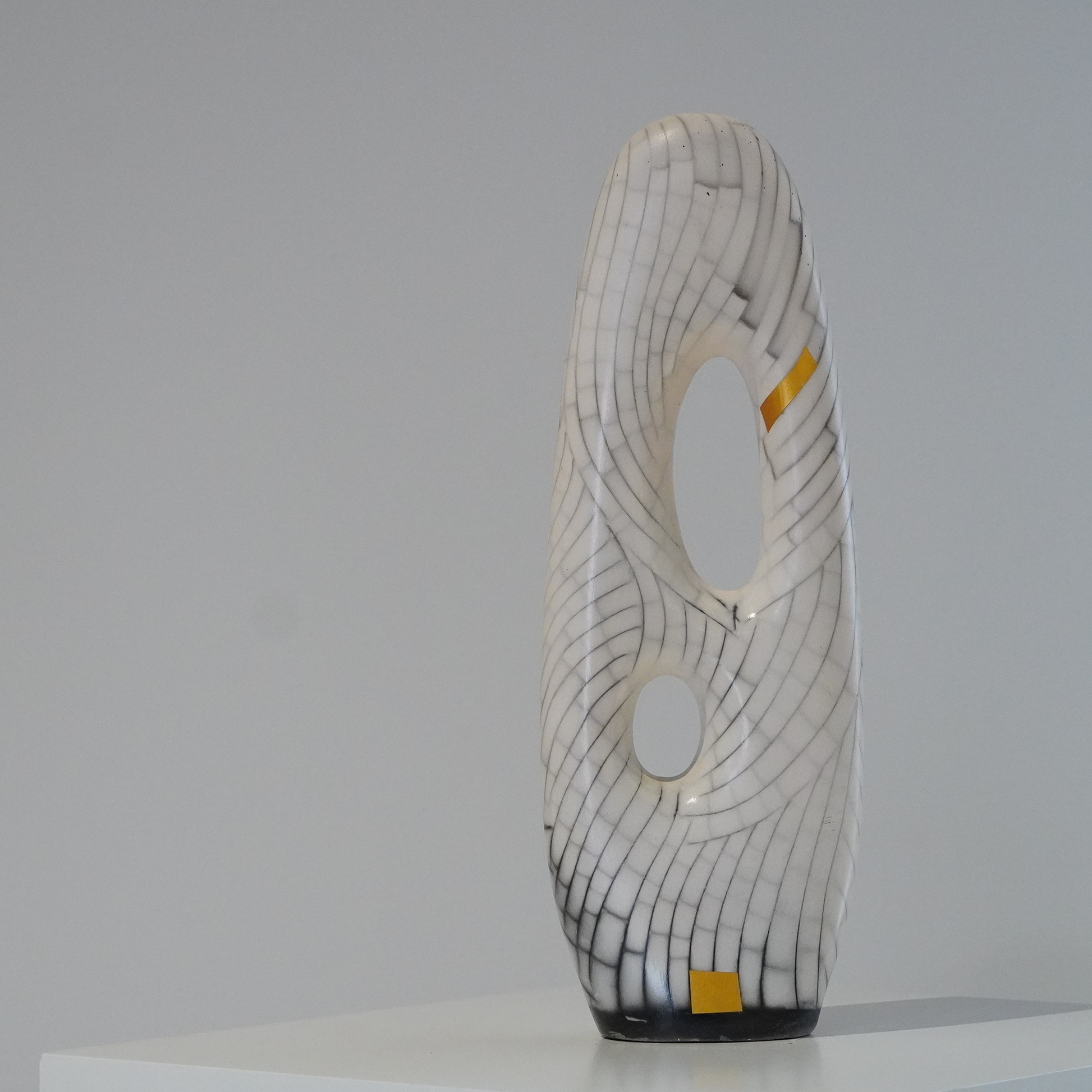 The Golden Echo Portal by Xiang Da is a captivating fusion of sculptural form and luminous detail. Its elongated silhouette, intersected by dual openwork apertures, invites light to dance through the piece, while the rhythmic linework and precisely placed gold accents create a refined sense of movement and spatial poetry.