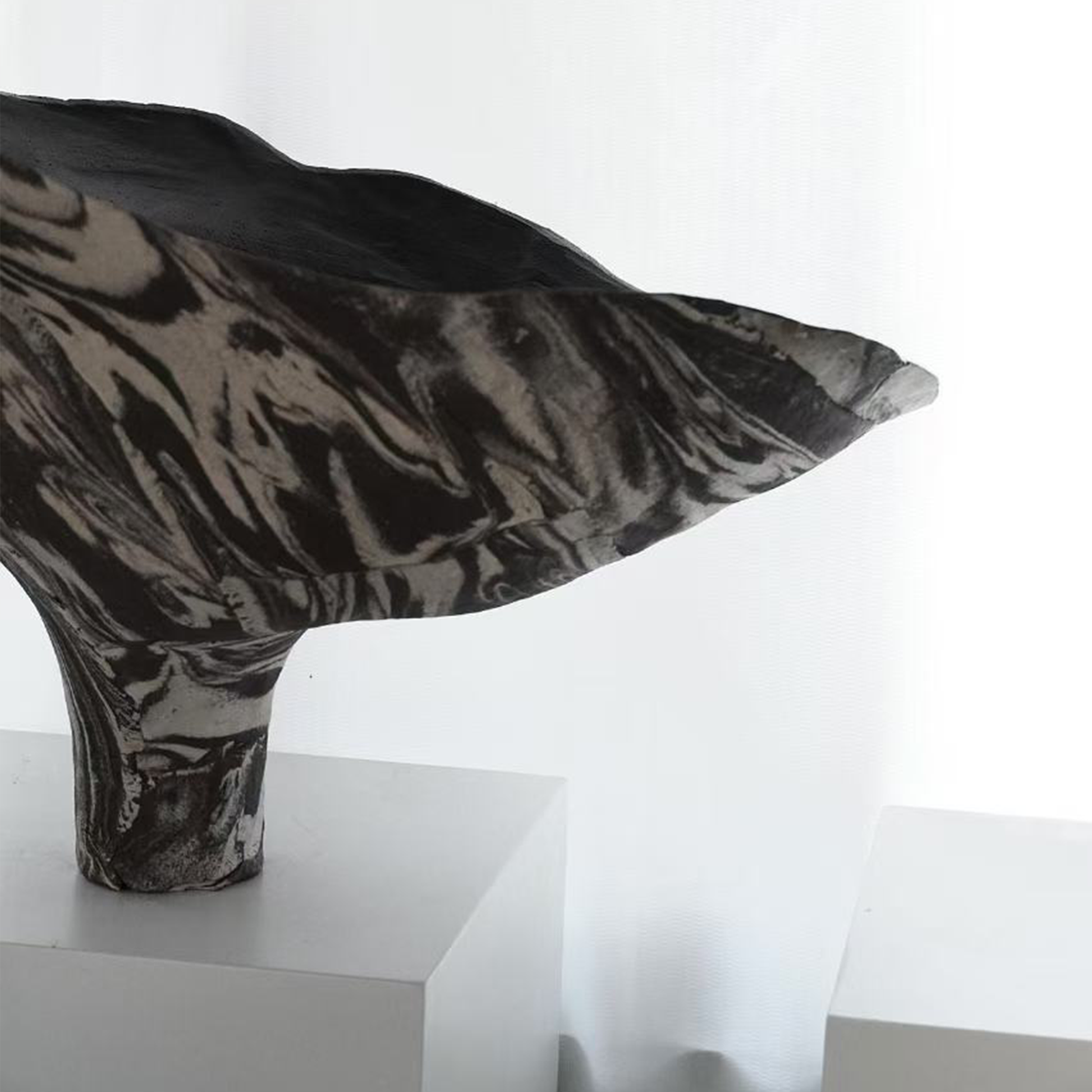 The Marbled Bloom Vessel by Xiang Da opens like a flower held in motion—its broad, asymmetric form capturing a sense of quiet dynamism. The self‑developed slip‑decorated clay body reveals a marbled surface of flowing black and white, giving the work depth, movement, and understated elegance.