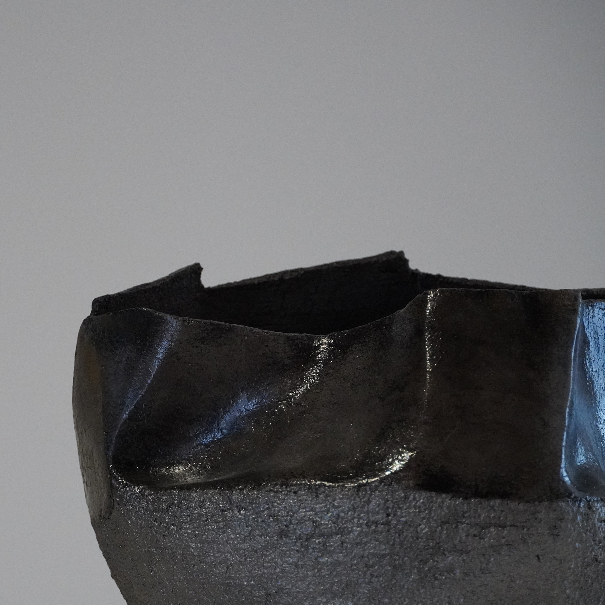The Onyx Wave Vessel by Xiang Da showcases a striking sculptural form where two contrasting textures meet: the raw, volcanic-like surface of the body and the smooth, metallic-sheen folds of its undulating rim. This interplay of matte and reflective qualities adds depth and movement, capturing the eye from every angle.